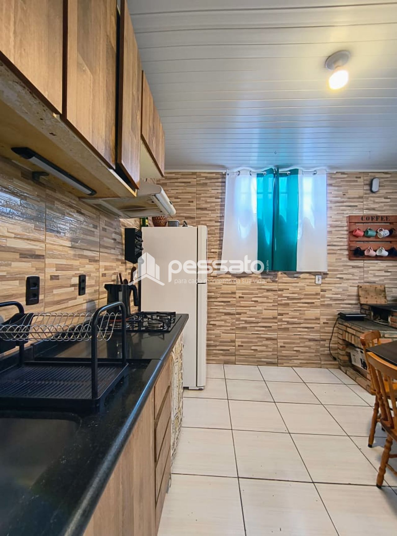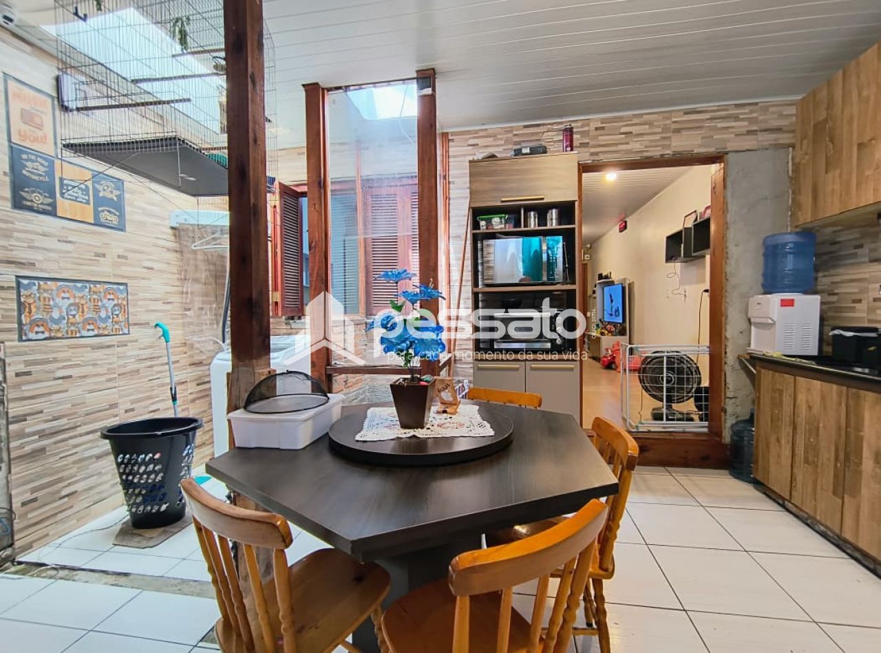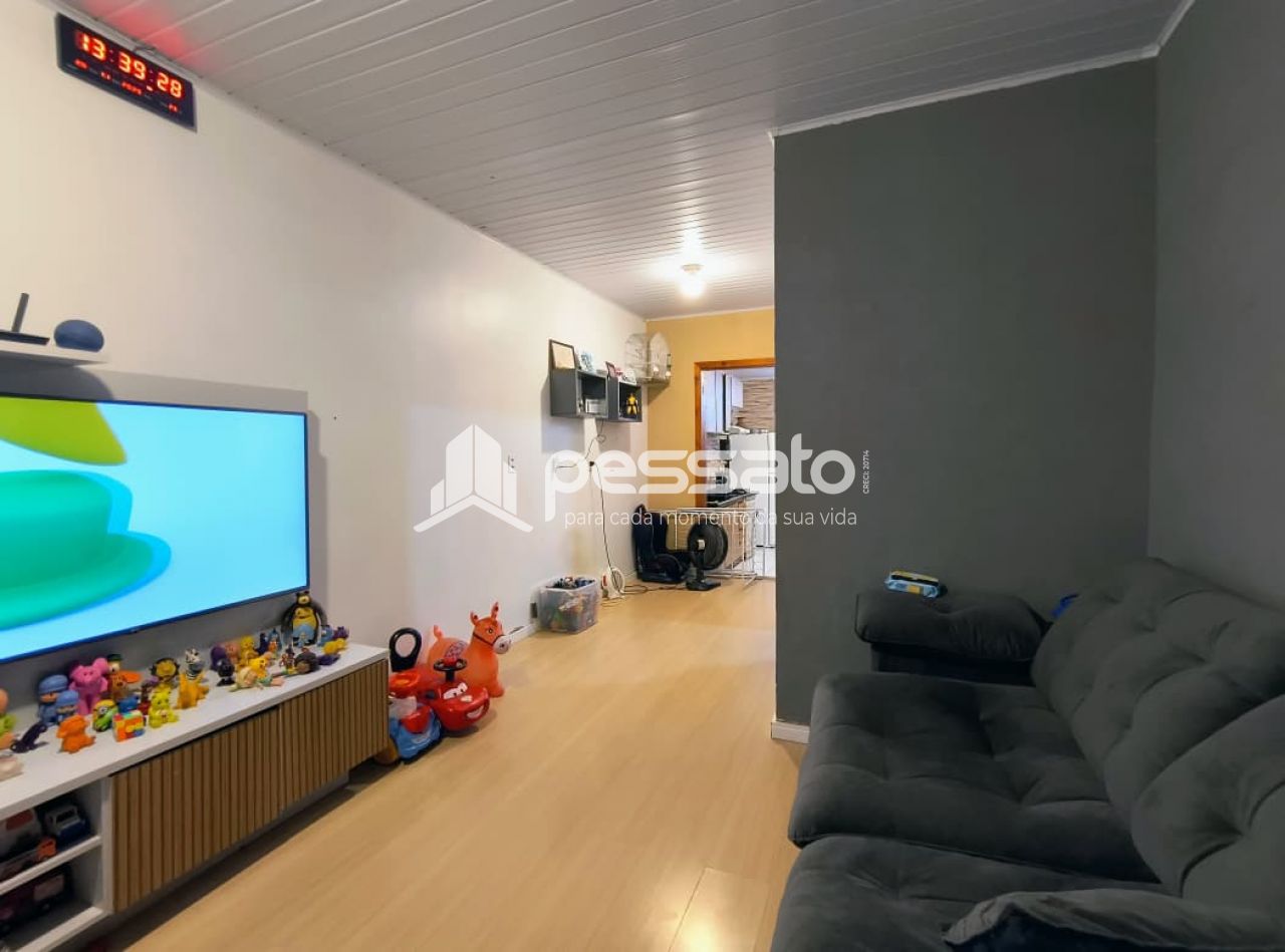 Com 90m², a casa conta com 2 dormitórios com roupeiro, sala de estar e jantar, cozinha com móveis planejados, fogão a lenha, banheiro com box de vidro temperado, 2 vagas de estacionamento cobertas, piso cerâmico e iluminação.