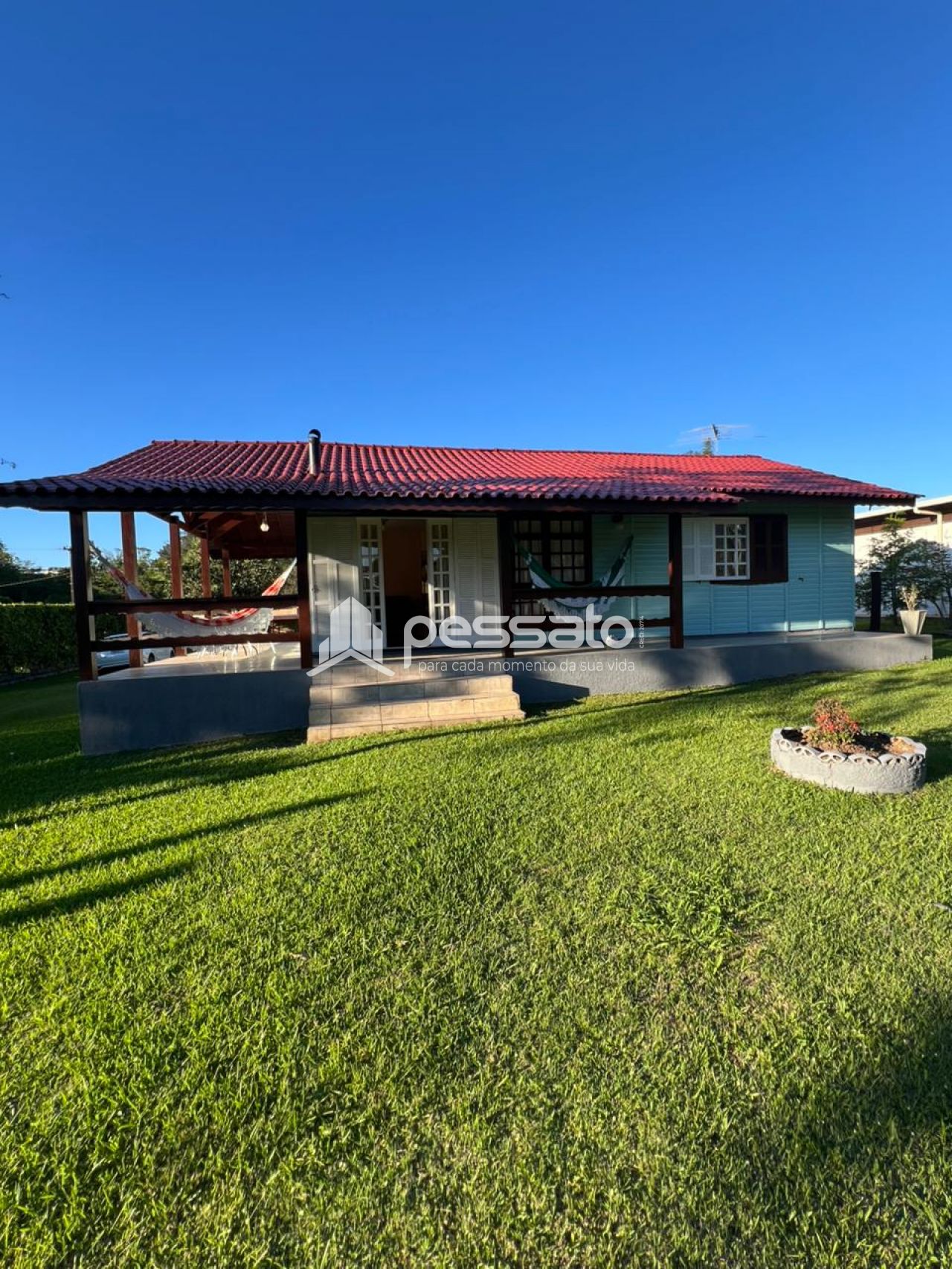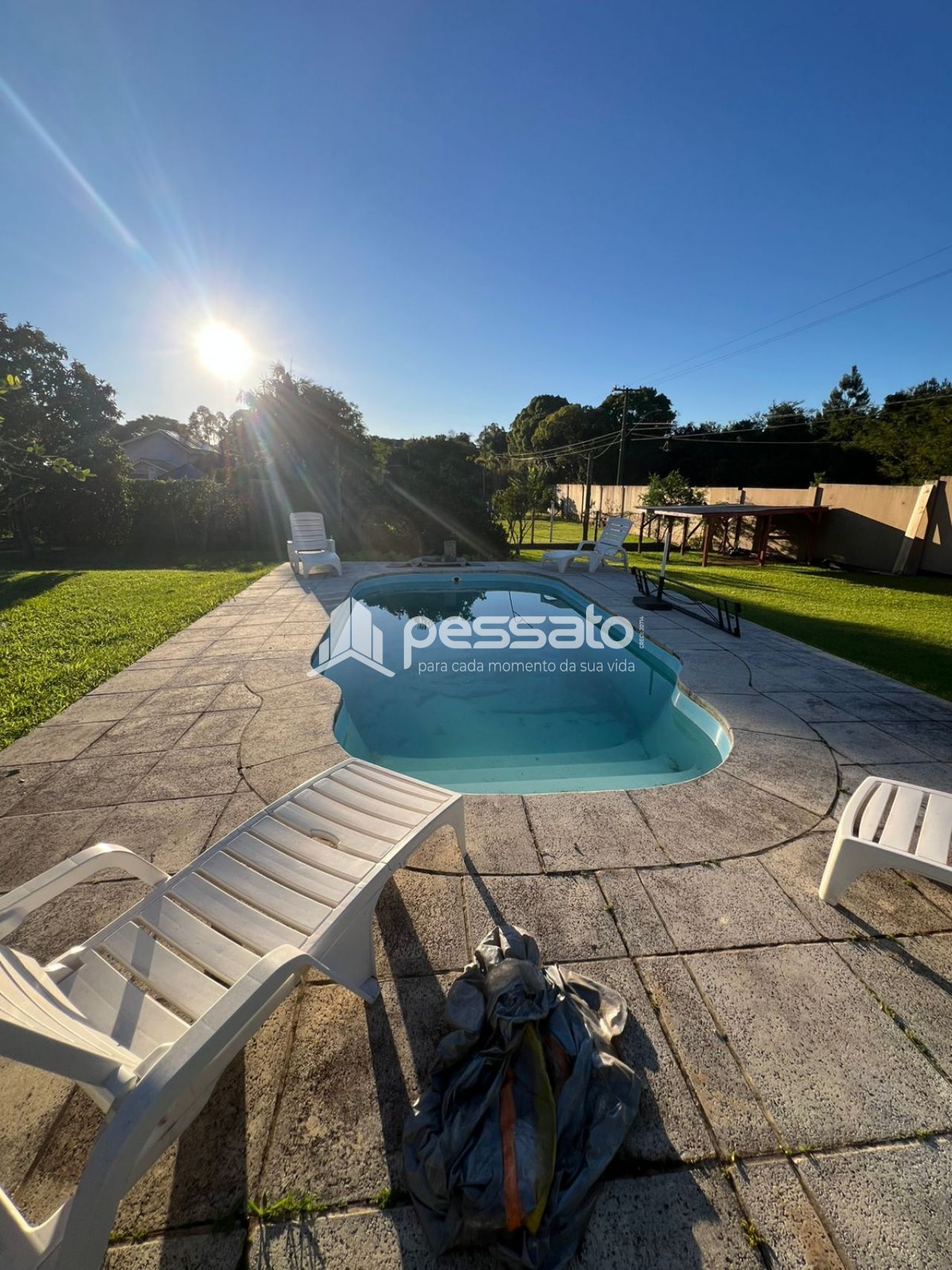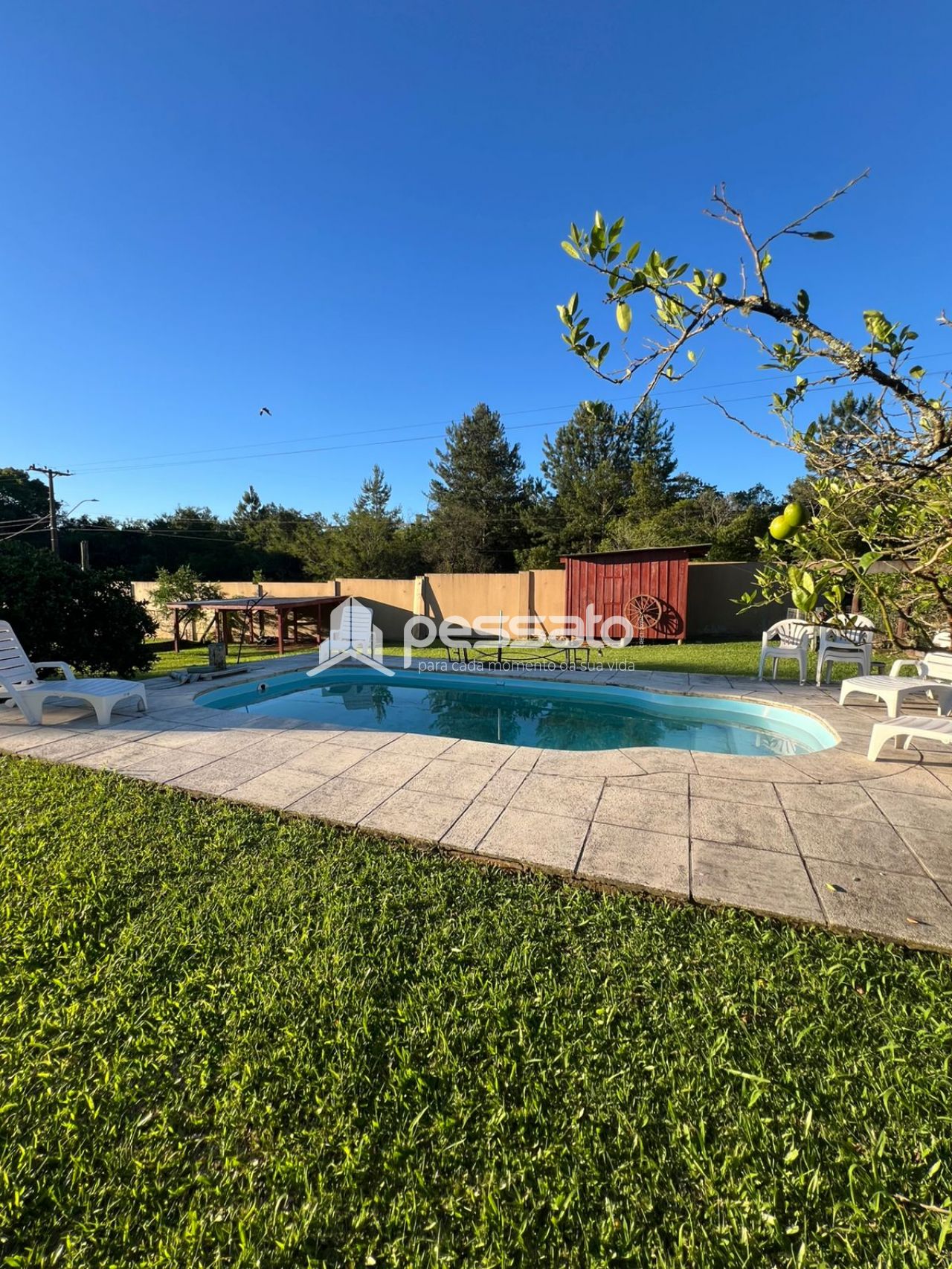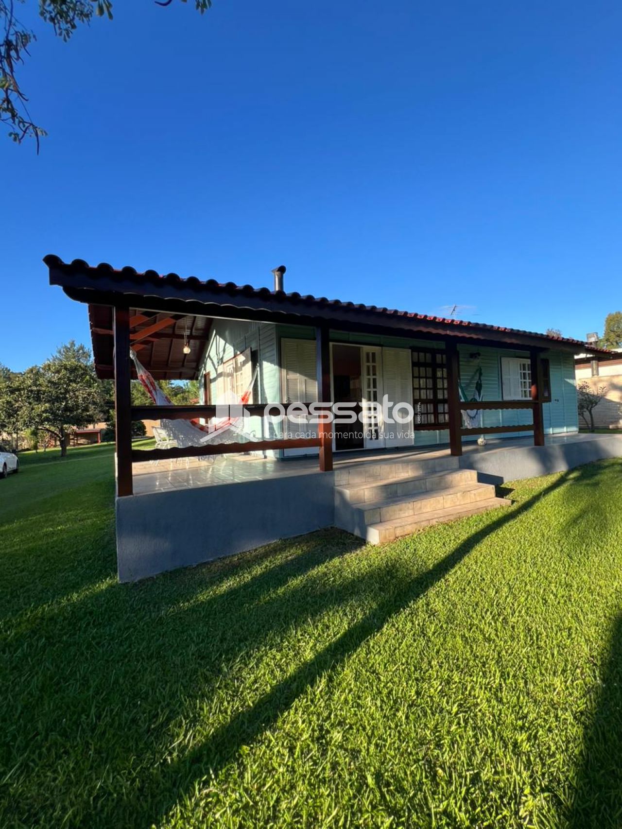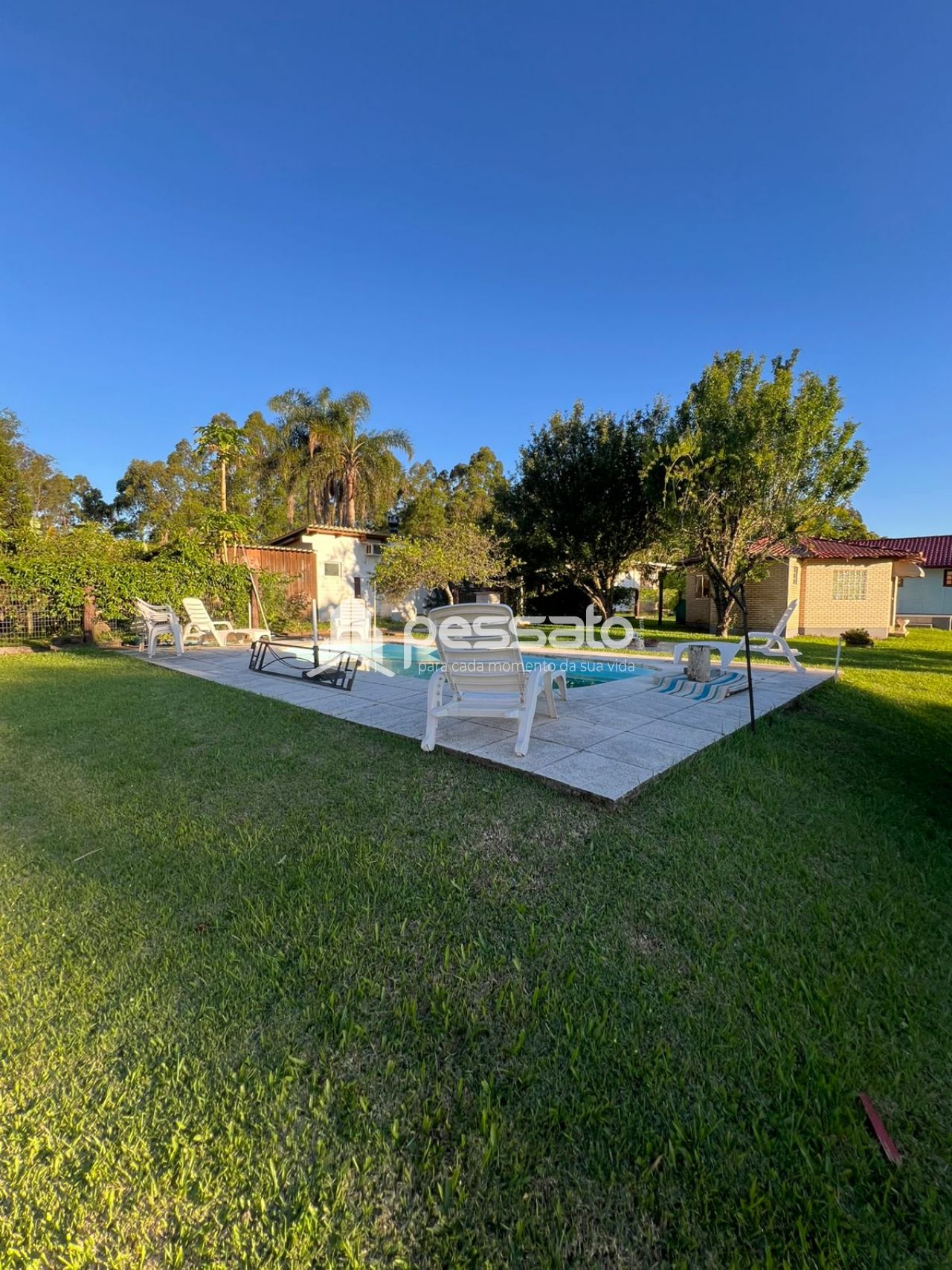 O imóvel possui 2 dormitórios, sala de estar e janta, cozinha planejada, área de serviço, 2 banheiros e vaga de garagem ampla. A área externa conta com piscina e árvores, oferecendo conforto e contato com a natureza.