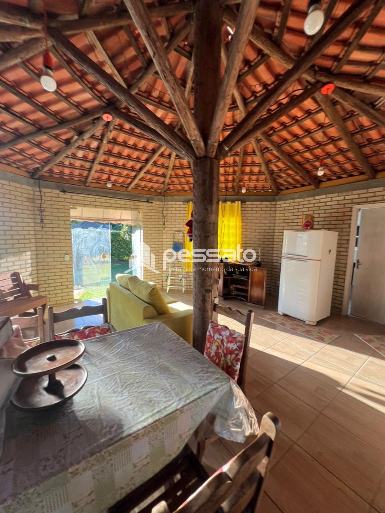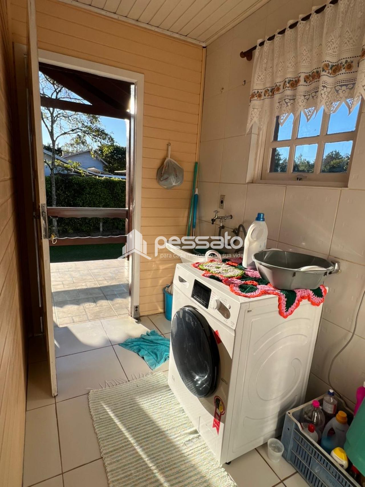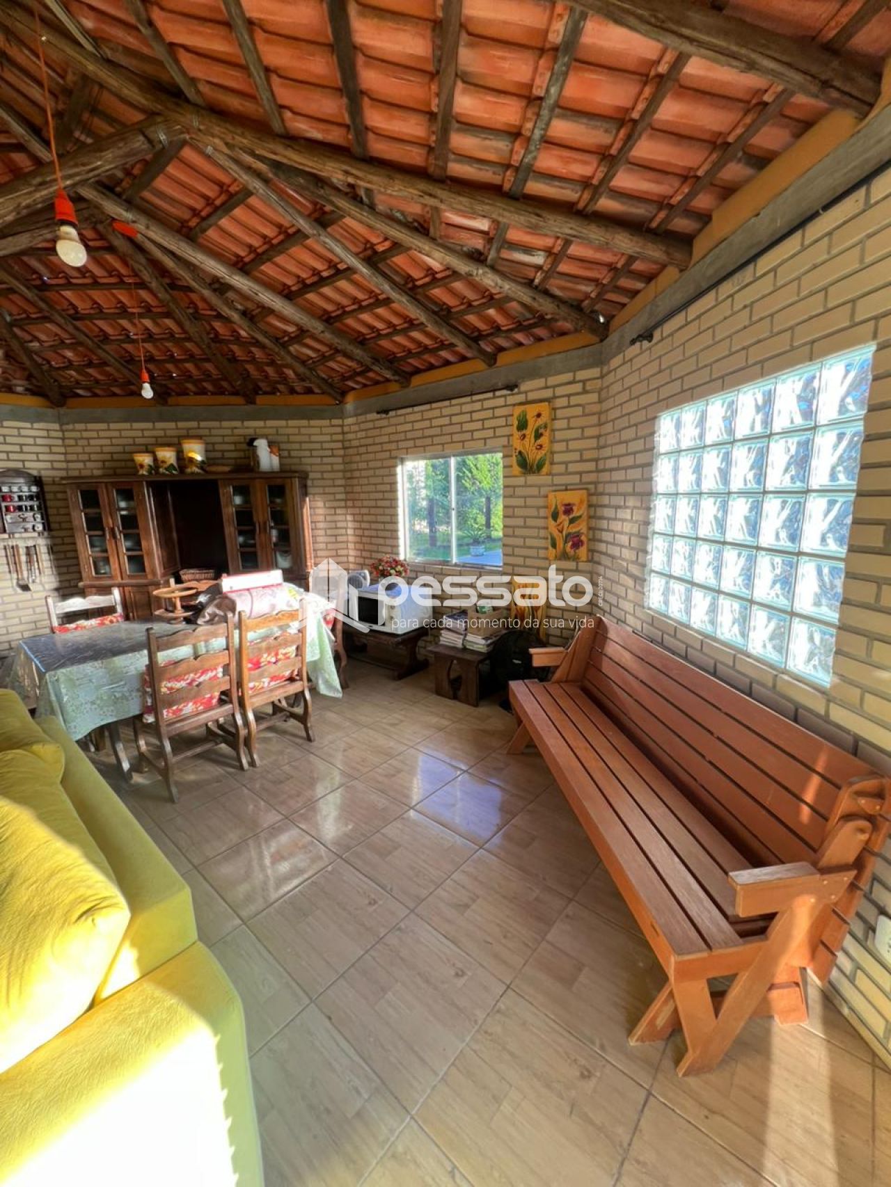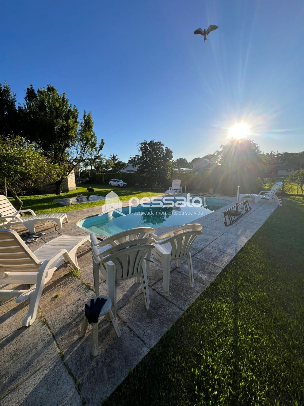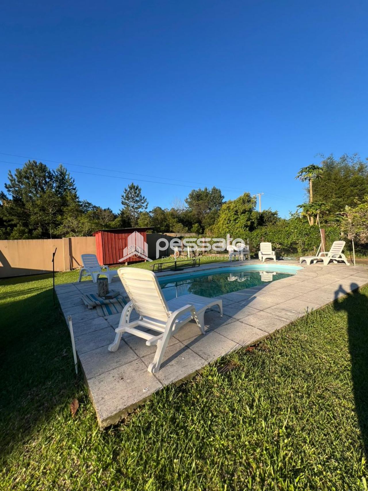 O imóvel possui 2 dormitórios, sala de estar e janta, cozinha planejada, área de serviço, 2 banheiros e vaga de garagem ampla. A área externa conta com piscina e árvores, oferecendo conforto e contato com a natureza.
