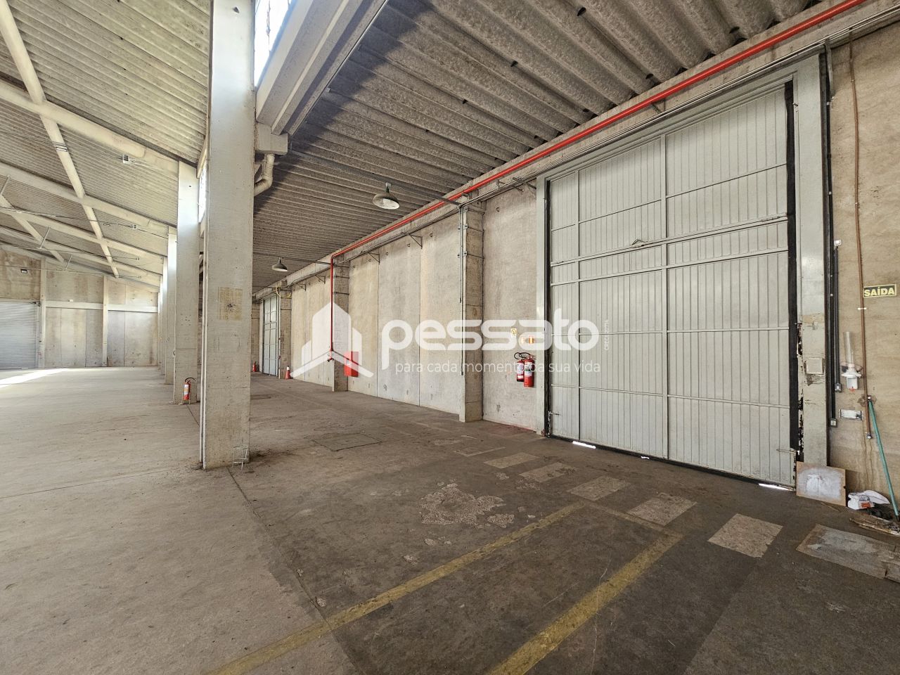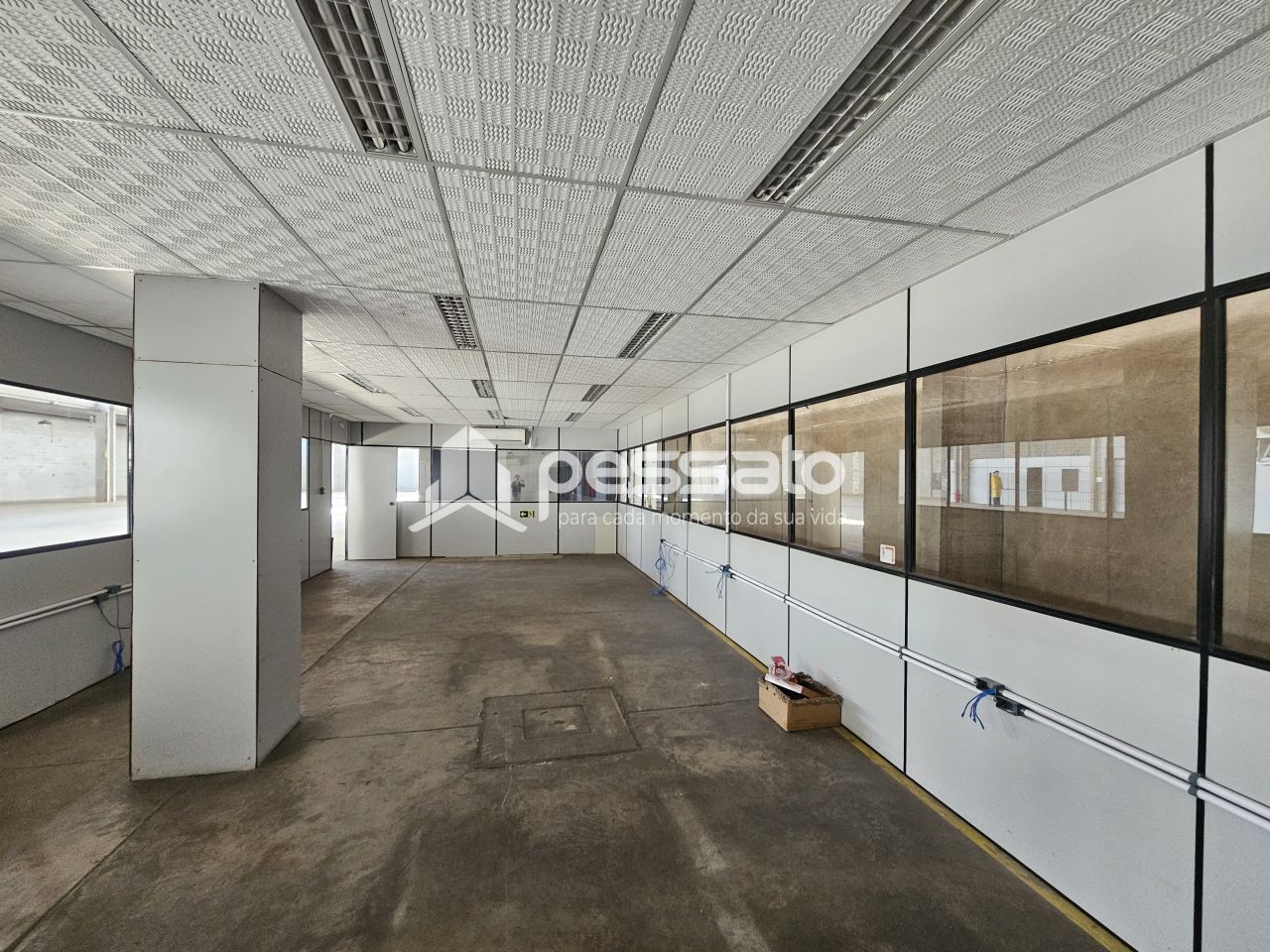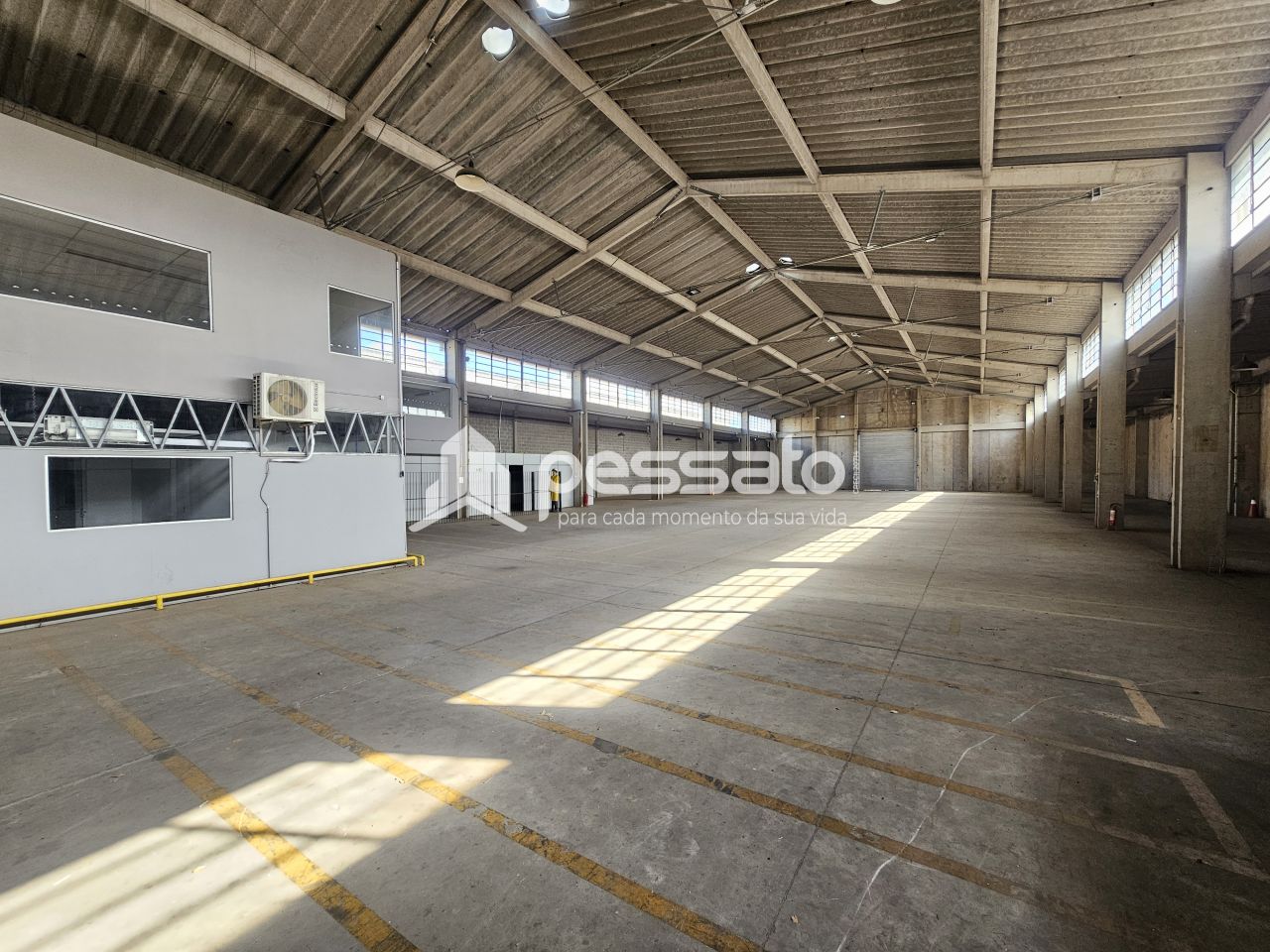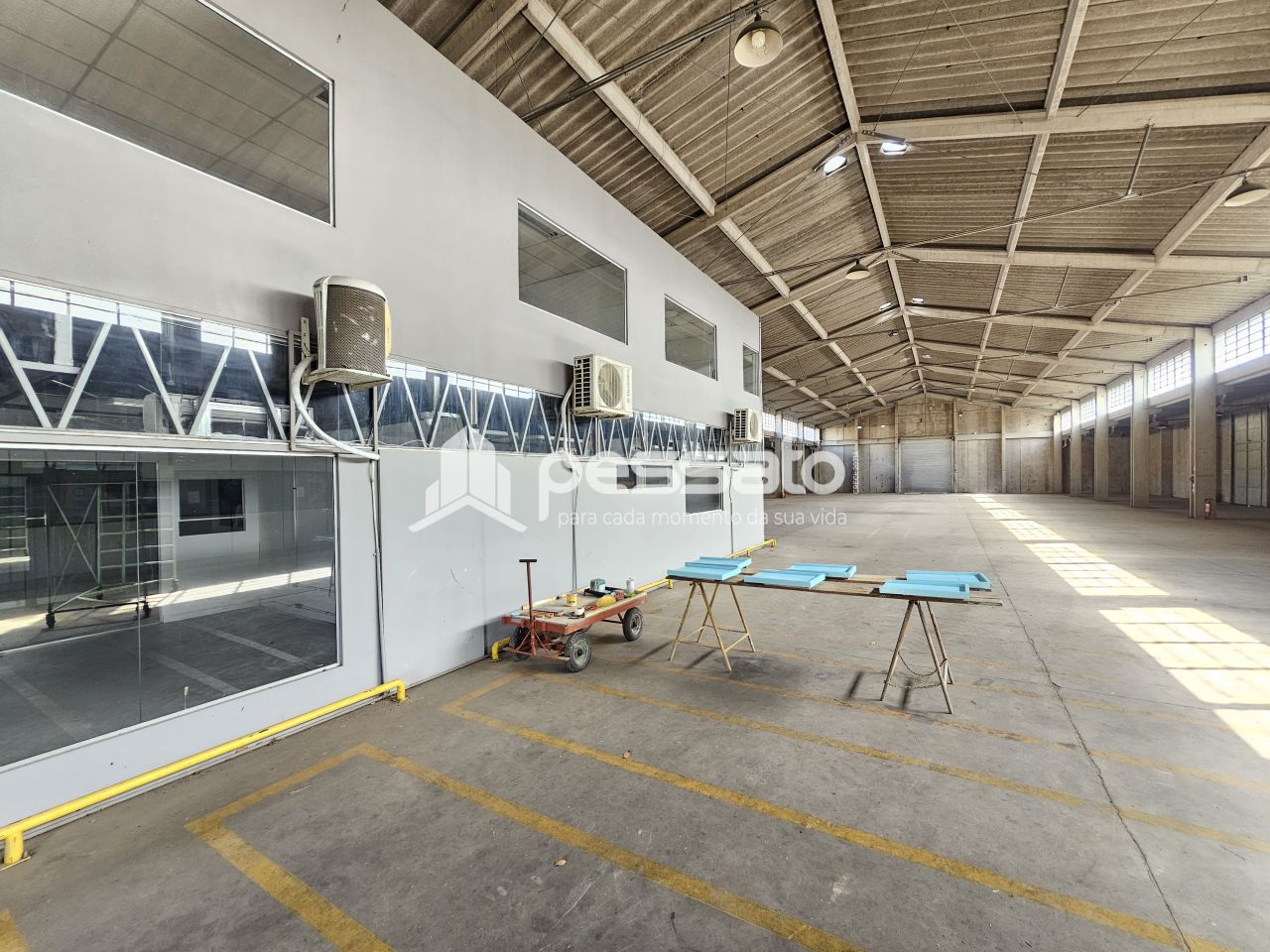 O imóvel conta com 1800 m² de área construída, pé direito de 9 m², 02 docas, mezanino, escritório com salas com ar condicionado, e 04 banheiros.